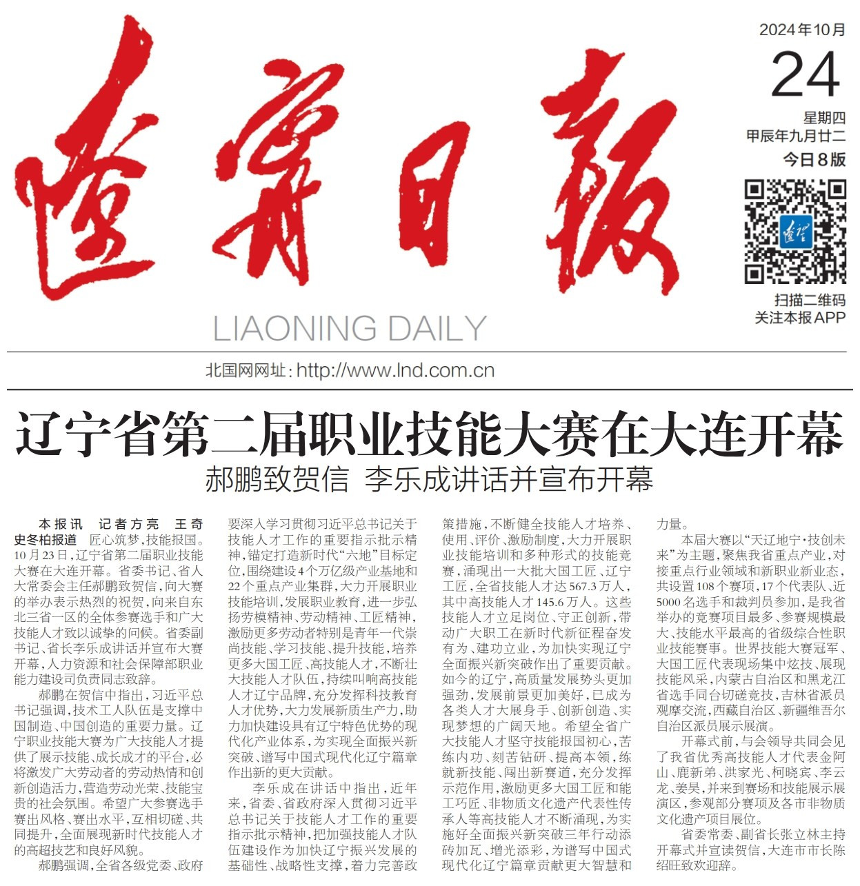 本报讯 记者方亮 王奇 史冬柏报道 匠心筑梦,技能报国。10月23日,辽宁省第二届职业技能大赛在大连开幕。省委书记、省人大常委会主任郝鹏致贺信,向大赛的举办表示热烈的祝贺,向来自东北三省一区的全体参赛选手和广大技能人才致以诚挚的问候。省委副书记、省长李乐成讲话并宣布大赛开幕,人力资源和社会保障部职业能力建设司负责同志致辞。