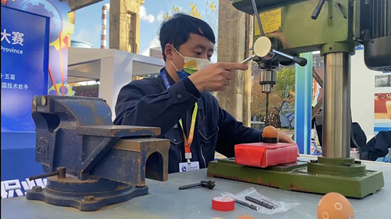 在大赛展演区,来自沈阳飞机工业集团有限公司的钳工华成祥将生鸡蛋放在电钻下,慢慢放下钻头,一手扶住鸡蛋,一手操作电钻,随着钻头高速转动,鸡蛋周围冒起肉眼难以分辨的微小粉末。10秒钟左右,钻头抬起,停止转动。厚度为0.2毫米的蛋可上出现一个小圆孔,但是蛋膜却完好无损,一滴蛋清都不会流出来。