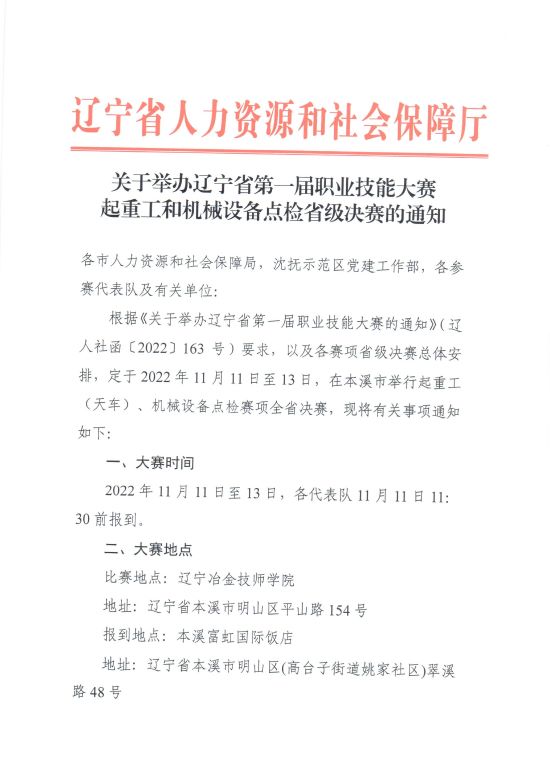 关于举办辽宁省第一届职业技能大赛起重工和机械设备点检省级决赛的通知