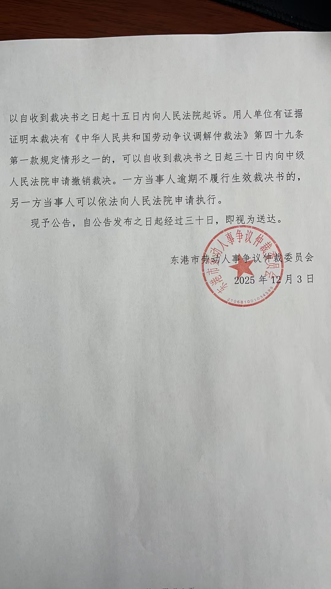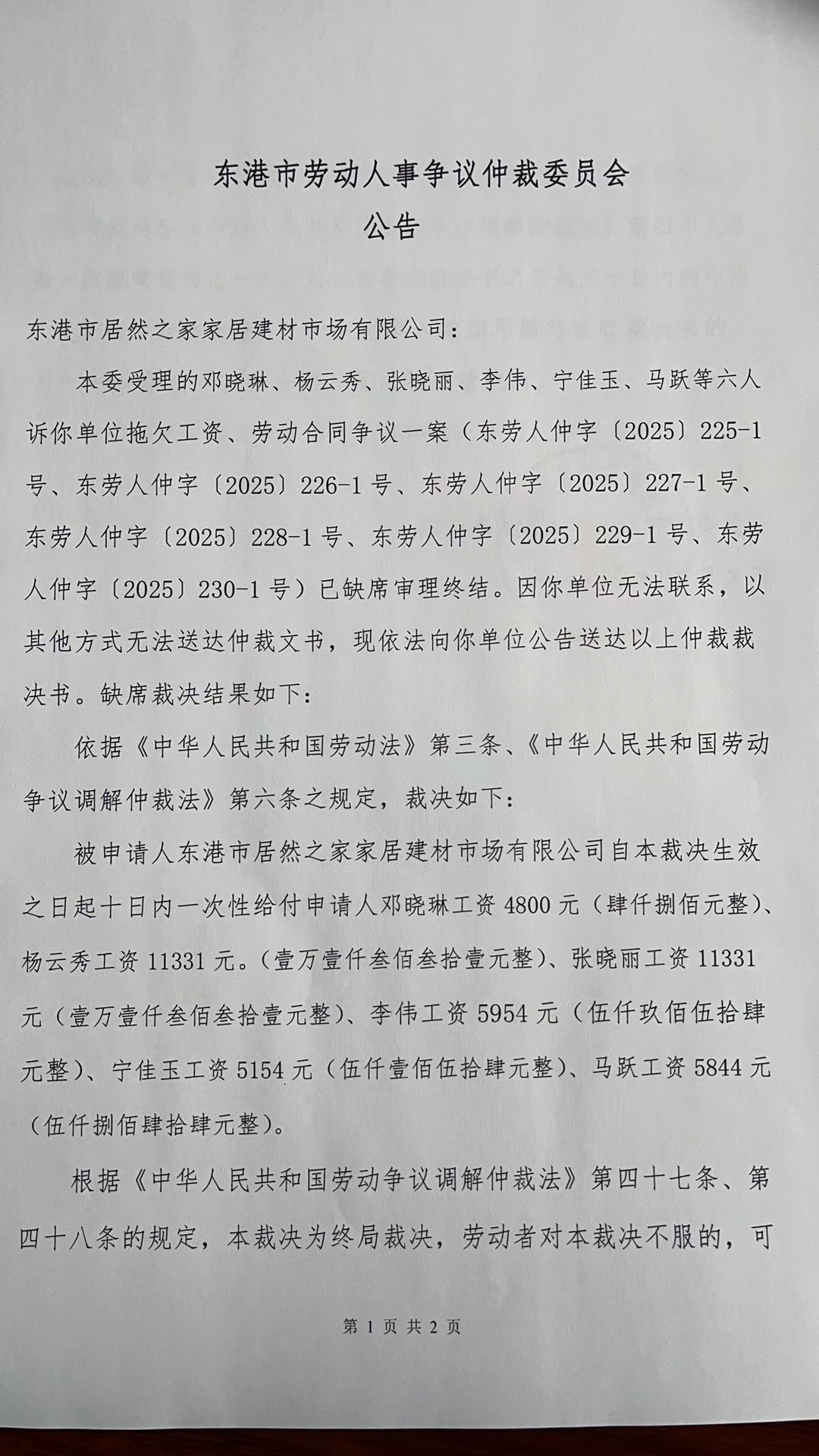 本委受理的邓晓琳、杨云秀、张晓丽、李伟、宁佳玉、马跃等六人诉你单位拖欠工资、劳动合同争议一案(东劳人仲字〔2025〕225-1号、东劳人仲字〔2025〕226-1号、东劳人仲字〔2025〕227-1号、东劳人仲字〔2025〕228-1号、东劳人仲字〔2025〕229-1号、东劳人仲字〔2025〕230-1号)已缺席审理终结。因你单位无法联系,以其他方式无法送达仲裁文书,现依法向你单位公告送达以上仲裁裁决书。缺席裁决结果如下: