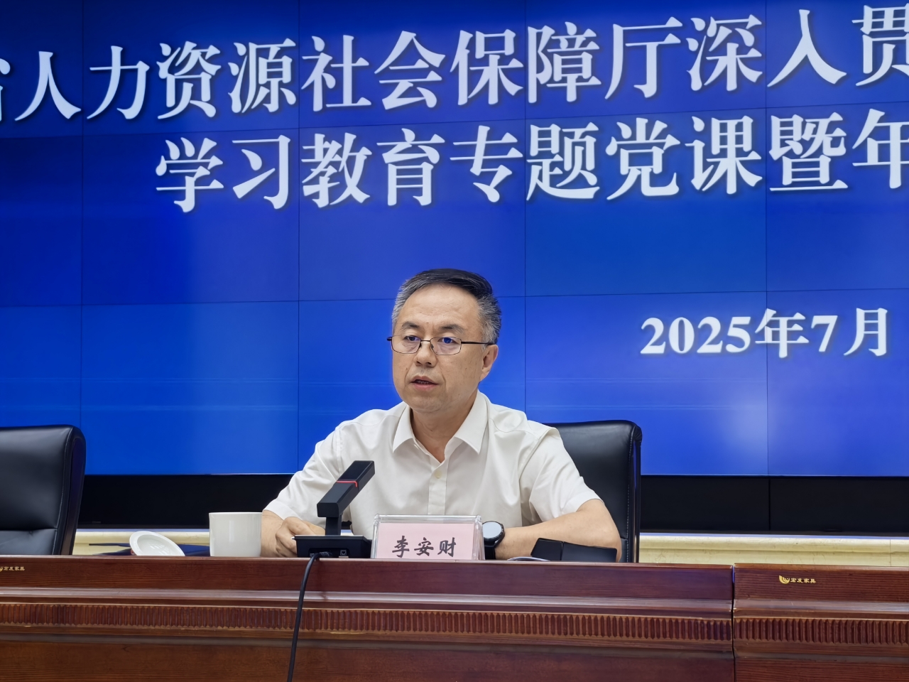 7月2日,省人力资源社会保障厅举办深入贯彻中央八项规定精神学习教育专题党课暨年轻干部座谈会,以“同心向党庆七一 优化作风提效能 实干担当促发展”为主题,进一步优化全厅年轻干部队伍作风建设,大力推动深入贯彻中央八项规定精神学习教育走深走实。会上,传达学习了省委书记、省人大常委会主任郝鹏在省委深入贯彻中央八项规定精神学习教育专题党课暨年轻干部座谈会上的讲话精神。厅党组书记、厅机关党委书记、厅长李安财与年轻干部亲切座谈交流,讲授深入贯彻中央八项规定精神学习教育专题党课。厅机关及厅属事业单位8位年轻干部结合工作实际作交流发言。